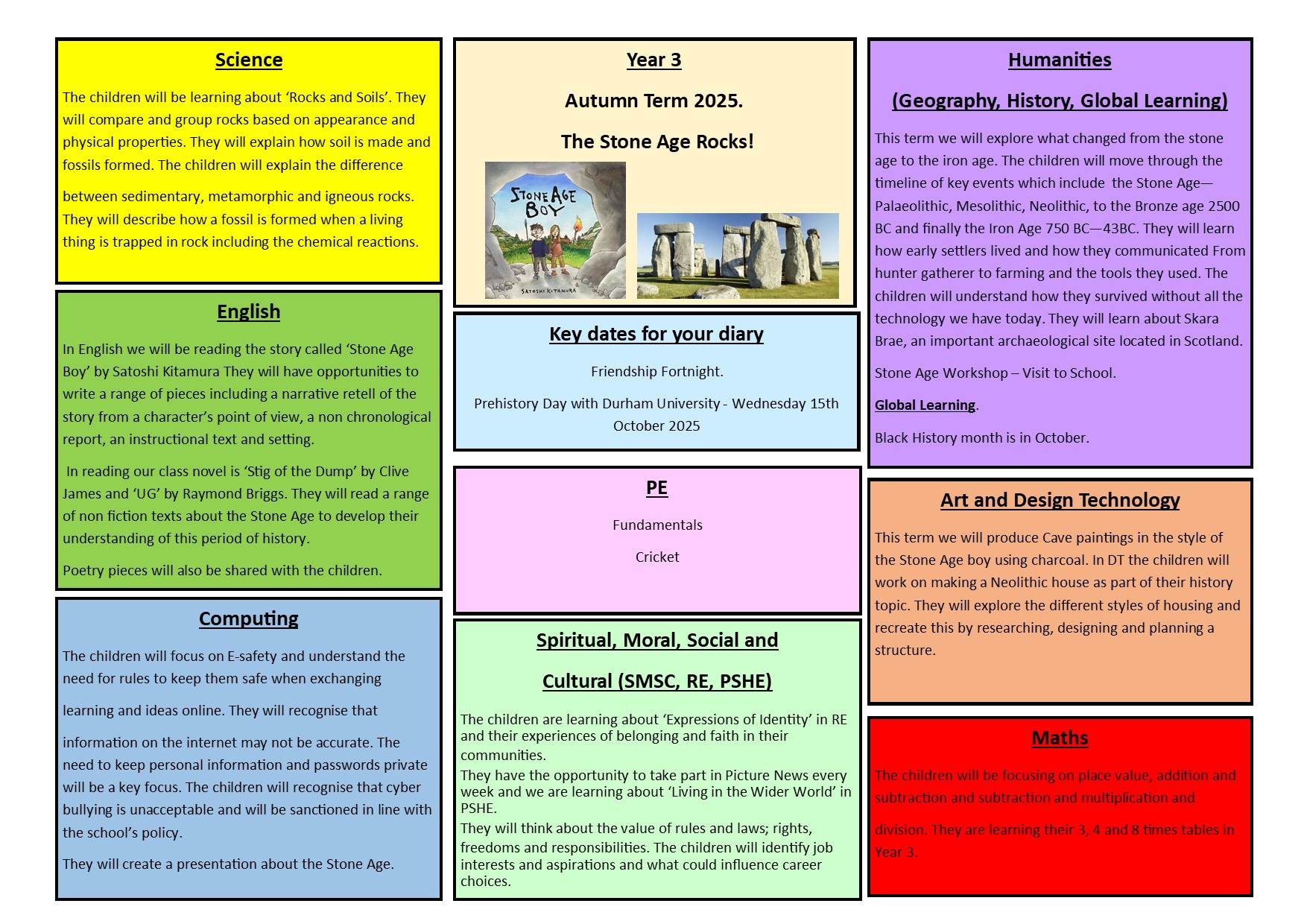 In history the children have explored changes from the tone age to the iron age. A highlight was when special visitors from Durham University joined us for a Stone Age workshop in school.